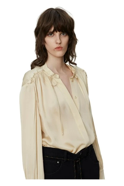 Deze knoopblouse heeft gebufferde polsen, een ondergedompelde zoom en banden bij de nek. Draag verscholen in hoogbouwbroeken voor een professionele outfit. Kwaliteit: 100% viscose