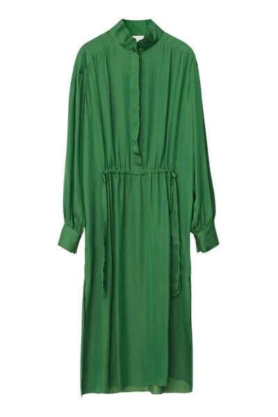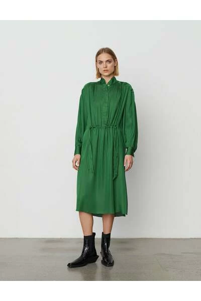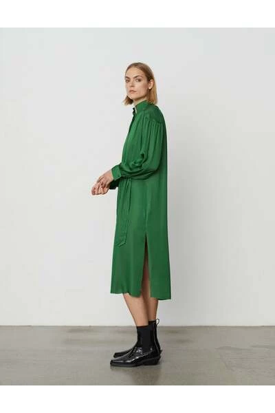 Deze MIDI-lengte jurk heeft een knooppleet van de nek tot de taille, een trekkoord over de taille en een gedompelde zoom. Er zijn spleten aan de zijkanten en manchetten met knoop. Deze jurk heeft een losse pasvorm. Kwaliteit: 100% polyester