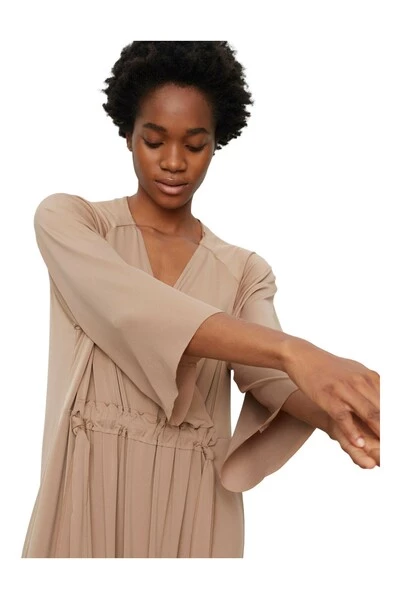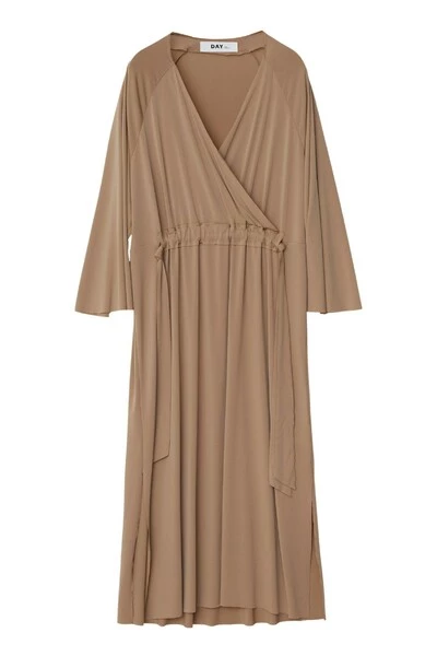 Een zachte, zwevende jerseyjurk met een wikkelvoorkant, driekwart lengtegaten en trekkoord voor de taille. De jurk heeft een midi-lengte en extra grote pasvorm. Draag met een oversized vest voor een casual, stijlvolle uitstraling. Het model is 178 cm lang en draagt ​​maat S. Kwaliteit: 95% polyester 5% elastaan
