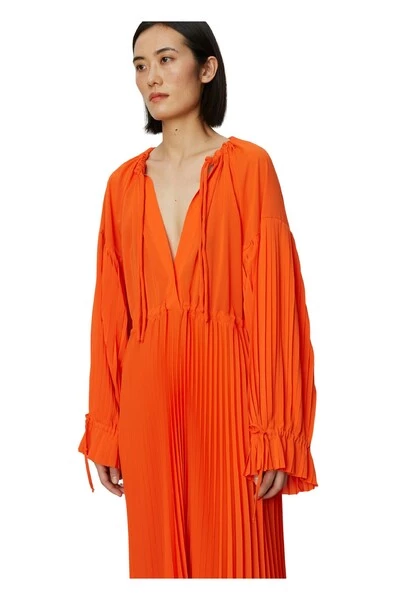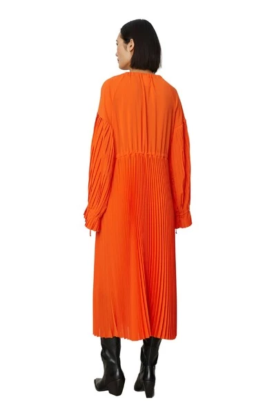 Een midi-lengte jurk met een diepe V-neck en trekstringbind aan de bovenkant van de nek. De jurk is voorzien van plissé -mouwen en rok, evenals trekstrings in de taille en polsen. Koppel met muilezels met hoge hak voor een elegante avondje uit look. Kwaliteit: 100% polyester (gerecycled)