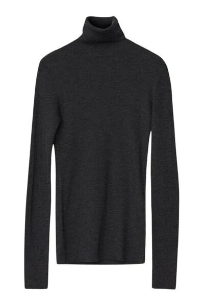 Een rolhals, dun breiing met een geribbelde textuur en rekbaar gevoel. Draag onder een jurk met V-hals voor een moderne gelaagde look. Kwaliteit: 100% merinowol