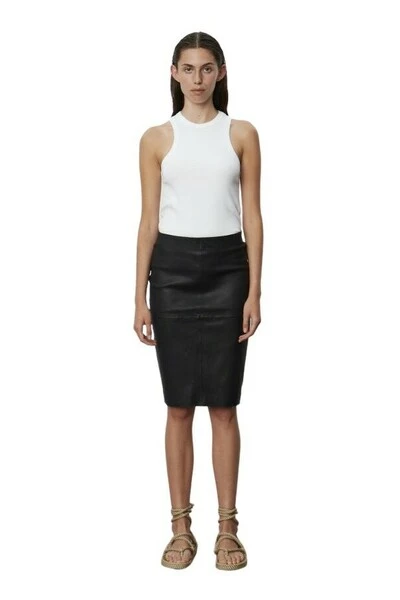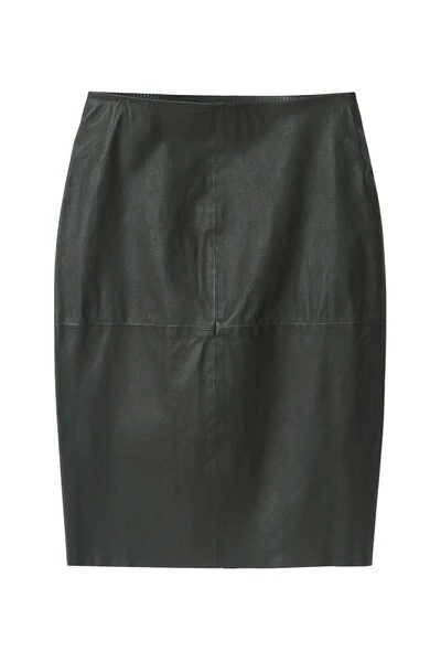 Deze lederen kokerrok heeft zich uitstrekt aan de stof, een elastische tailleband en zichtbare lambrisering overal. Het is niet gedetineerd. Draag het met een op maat gemaakte blazer voor een moderne kantoorlook. Materiaal: 100% echt lamsleer