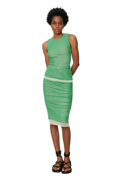 Deze knielengte, rekbare kokerrok heeft een dubbele laag gaas en ruches bij de kinderen die flatterend draperen. Het heeft een elastische tailleband. De onderlaag gluurt uit naar een getextureerde look. Draag met een extra grote brei voor een gemakkelijke en chique look. Het model is 178 cm lang en draaggrootte S.Quality: 92% polyester (gerecycled) 8% elastaan