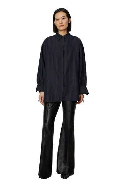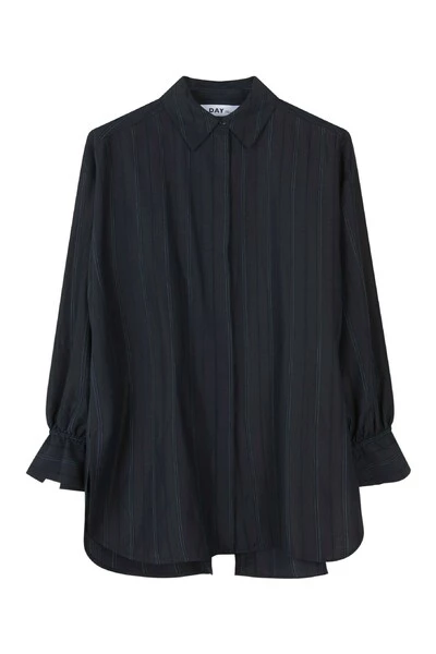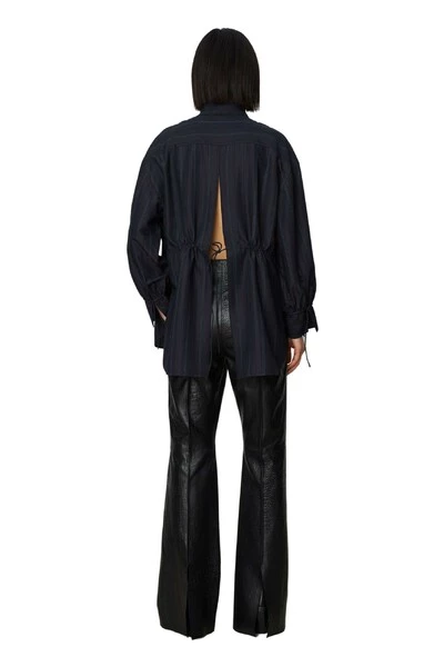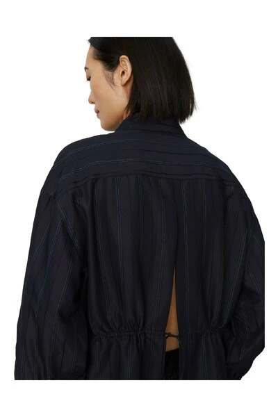 Een button-up shirt met banden bij de polsen, gedompelde zoom en een open rug. Er is een trekkoord aan de achterkant die in het midden kan worden gebonden. Draag open over een jurk voor een modern, speels silhouet. Kwaliteit: 85% viscose 15% nylon