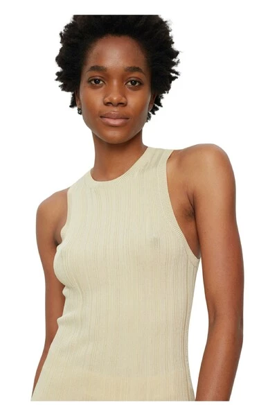 Een strakke, rekbare geribbelde mouwloze jurk. De jurk heeft een maxi -lengte en korte spleten aan de zijkanten. Draag met een extra grote brei bovenop voor een stijlvolle en comfortabele look. Het model is 178 cm lang en draagt maat S. Kwaliteit: 72% viscose 28% polyamide