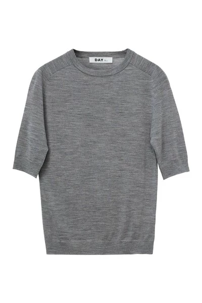 Een dun gebreide pullover-t-shirt met ribbels aan de mouwen, zoom en nek. Draag met hoge taille broek voor een klassiek, professioneel ensemble. Kwaliteit: 100% merinowol