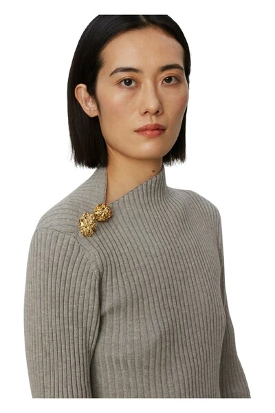 Een lange, rekbare wol- en katoenmix-jumper met twee grote kerstballen aan de rechterschouder. Het heeft een geribbelde textuur, gebufferde polsen en een asymmetrische halslijn. Slijtage over gepaste broek voor een elegante look. Kvalitet: 65% wol 35% katoen