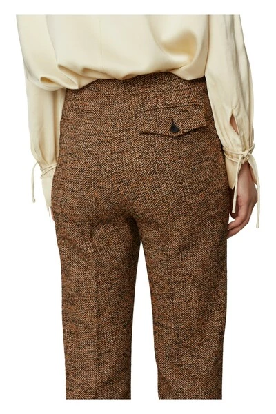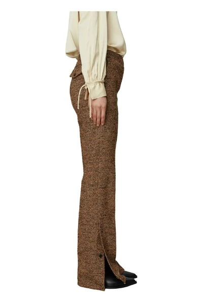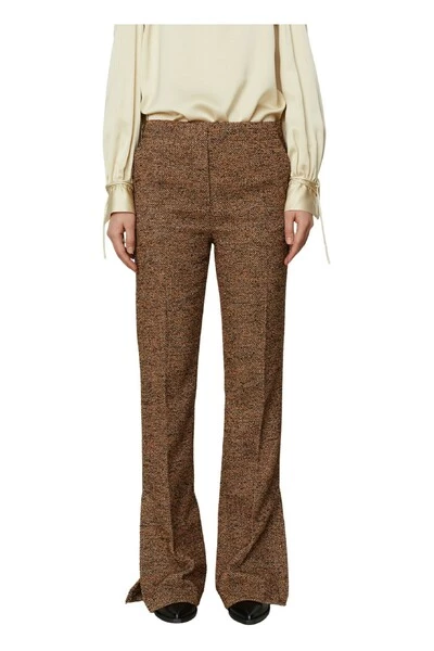 Deze getextureerde broek heeft een hoge taille en zipafsluiting aan de zijkant. Ze hebben een wijd uitlopende enkel met een knopafsluiting bij de flare. Draag met een gepast button-up shirt voor een professionele outfit. Kwaliteit: 50% wol (gerecycled) 20% polyester 15% polyacryl 12% polyamide 3% andere vezels